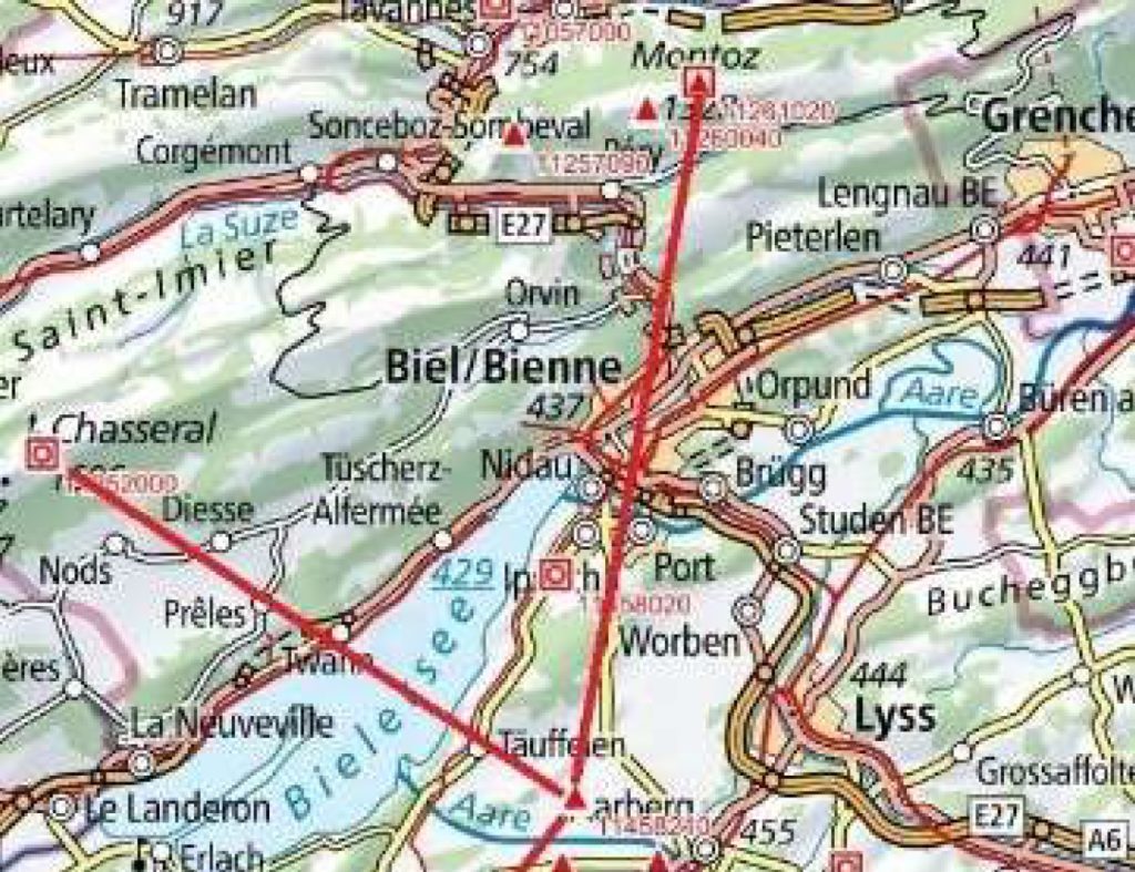 Pour reporter la longueur de la base (Walperswil – Sugiez) dans le réseau de triangulation, les angles depuis les points de la base vers les points voisins sont mesurés dans le terrain. A l’époque de Dufour, les points de Sugiez, du Chasseral et de Montoz furent visés depuis un point central situé à Walperswil.