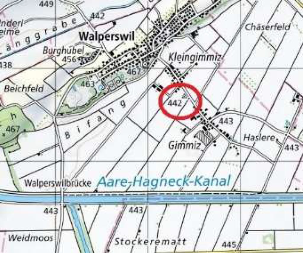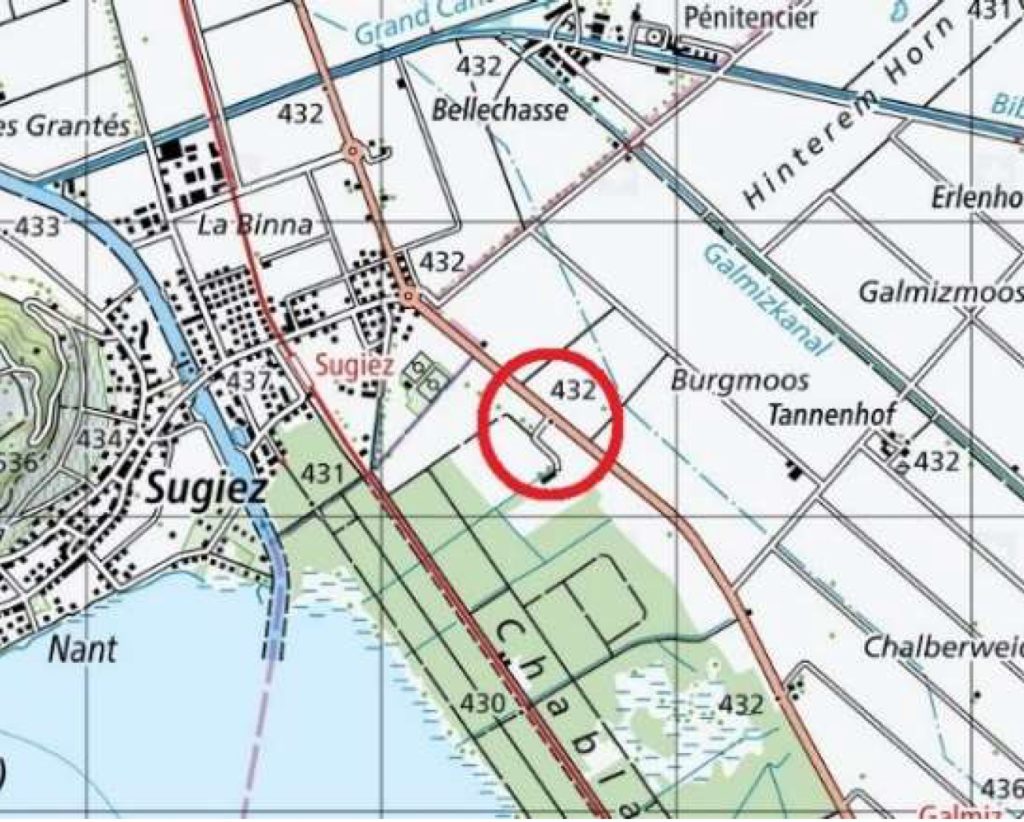 Un monument historico-culturel d’importance nationale. C’est ici, à l’Est de Sugiez, sur le territoire de la commune de Galmiz (point topographique 431, coordonnées 2 576 510 / 1 201 286), qu’une des bases les plus importantes de la mensuration nationale suisse a été piquetée. La distance de 13 km séparant le point de Walperswil a été mesurée par trois fois (1791 – 1797 – 1834) avec tout le soin et le savoir de l’époque et constitue une des bases géodésiques de la carte Dufour. Cette première image a permis la détermination géométrique de la dimension de la Suisse.
